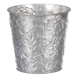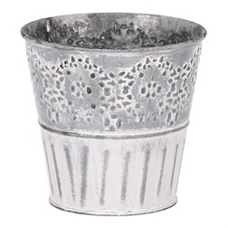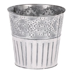 VýprodejObal kovový - kulatý, vysoký, s dřevěnou vločkou, bílý
