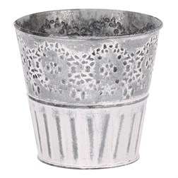 VýprodejObal kovový - kulatý, nízký, s dřevěnou vločkou, bílý