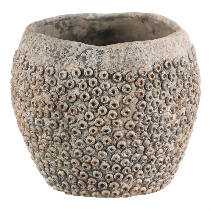Tento šedý betonový květinový obal zaujme svým nerovným tvarem a povrchem posetým umělými útvary, které připomínají schránky drobných měkkýšů. Svým provedením věrně přípomíná ručně zpracovaný výrobek v autentickém středomořském stylu. Ideální pro oživení vaší zahrady nebo terasy, tento obal přináší nádech přírody a elegance, zatímco jeho trvanlivý materiál zajišťuje dlouhou životnost.