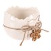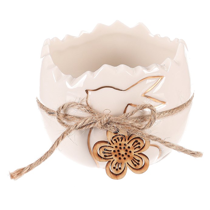 Keramický obal ve tvaru poloviny vajíčka, jakoby právě po vylíhnutí, je originální dekorací pro jarní období. Bílá barva a silueta zajíčka dodávají jemný, roztomilý vzhled, zatímco provázek a malý dřevěný květ dodávají na rustikálním kouzlu.