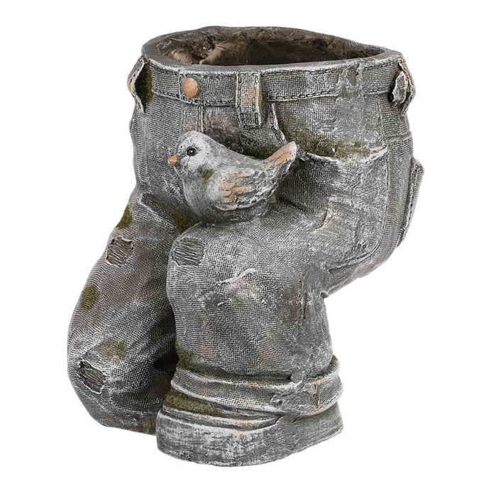 Šedý obal na květiny z magneziové keramiky ve tvaru kalhot s ptáčkem sedícím na kolenou se stane pozoruhodným dekoračním doplňkem vaší zahrady, terasy či jiného vhodného místa. Jeho originální design a nekonvenční vzhled bude přitahovat pozornost všech pozorovatelů. Tento dekorační obal vám umožní sladit krásu jeho jedinečnosti s půvabem rostlin v něm zasazených. Pořízením této unikátní dekorace uděláte radost především sami sobě a obohatíte svůj venkovní prostor o výjimečný kus dekorace. Získáte tím v podstatě malé umělecké dílo, které vám zpříjemní chvíle strávené venku.