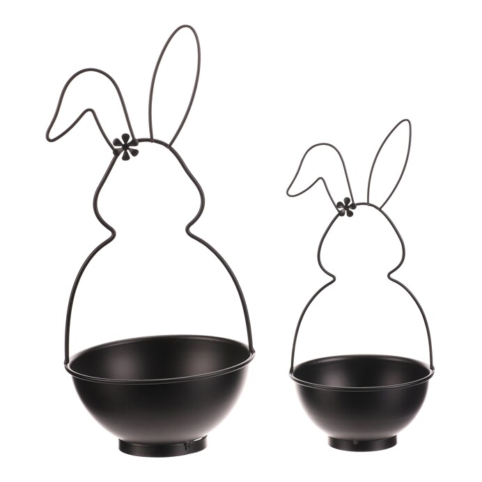 Sada dvou kovových obalů na květiny v černém provedení zaujme svým originálním tvarem zajíce s dlouhými ušima a drobným květinovým detailem. Obaly mají kulatý tvar s pevnou základnou, která zajišťuje stabilitu při umístění rostlin. Černá barva a minimalistický design umožňují snadné začlenění do různých interiérů i exteriérů. Jsou vhodné pro dekorativní aranžmá i praktické použití s květinami či dalšími rostlinami.