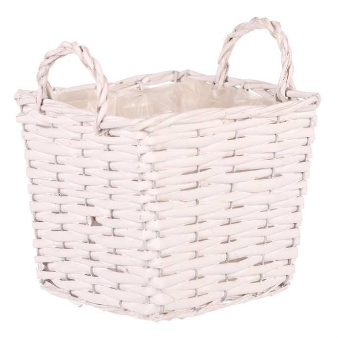 Hranatý proutěný košík na květiny v bílé barvě s ochrannou igelitovou fólií uvnitř je skvělou volbou pro elegantní a praktické aranžování rostlin. Tento košík kombinuje estetiku přírodního proutí s funkční ochranou, která zabraňuje prosakování vody a zajišťuje dlouhou životnost.