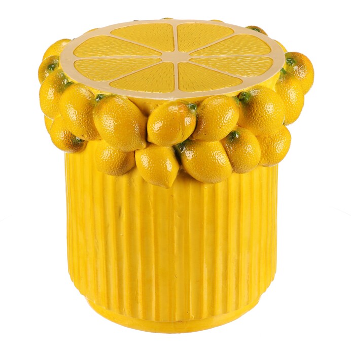 Taburet v jasně žlutém provedení z magnesia zaujme svým originálním designem připomínajícím plátek citronu s celými plody okolo horní části. Jeho pevný základ s jemně žebrovaným povrchem nabízí stabilní oporu a zároveň výrazný dekorativní prvek do interiéru. Vynikne v moderních i hravých prostorách, kde dodá svěží a energický akcent. Díky kompaktním rozměrům je vhodný jako doplňkový sedák nebo stylový odkládací stolek.