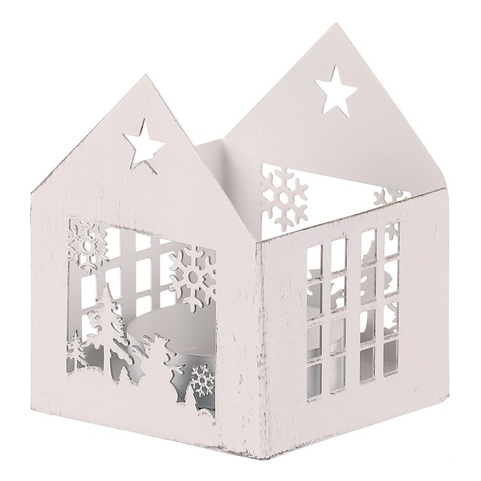 Malý kovový svícen ve tvaru domečku v bílém dekoru, dodá interiéru nádech elegance a možnost vyvolat kouzelný světelný efekt. Tento svícen nejenže přináší světlo a zářivou atmosféru, ale také představuje půvabný dekorační prvek pro váš domov. Umístěte do něj svíčku a sledujte, jak se zářivé světlo line prostorem. Ideální volba pro vánoční výzdobu, která okouzlí každého, kdo váš domov navštíví.