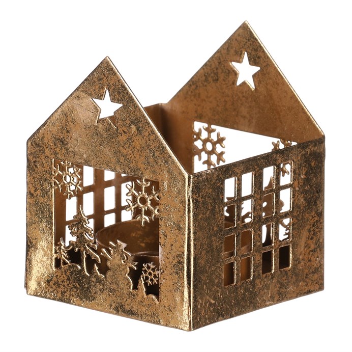 Malý kovový svícen ve tvaru domečku ve zlatém dekoru, dodá interiéru nádech elegance a možnost vyvolat kouzelný světelný efekt. Tento svícen nejenže přináší světlo a zářivou atmosféru, ale také představuje půvabný dekorační prvek pro váš domov. Umístěte do něj svíčku a sledujte, jak se zářivé světlo line prostorem. Ideální volba pro vánoční výzdobu, která okouzlí každého, kdo váš domov navštíví.
