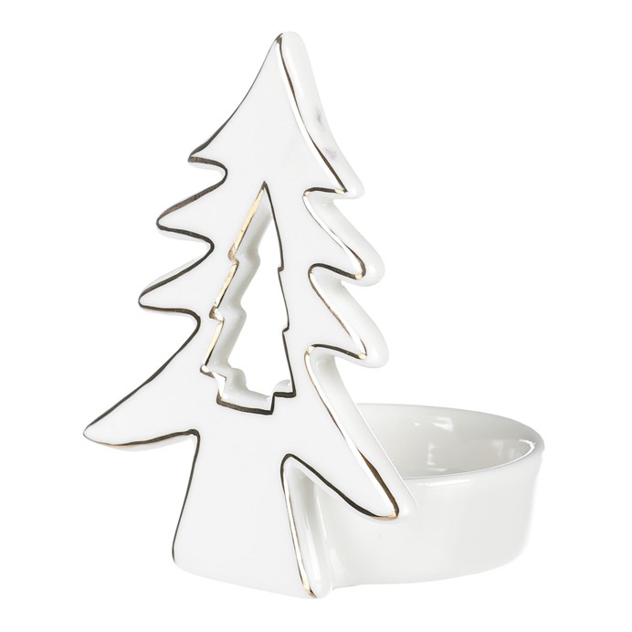 Bílý porcelánový svícen v podobě stromku a miskou na vložení čajové svíčky bude skvělým doplňkem vánoční či adventní výzdoby. Získáte tím elegantní ozdobu s možností vytvoření neodolatelného světelného efektu, díky plápolajícímu plaménku. Svým univerzálním provedením se hodí do každého prostoru a nabízí nespočet možností umístění a aranžování s dalšími dekoracemi.