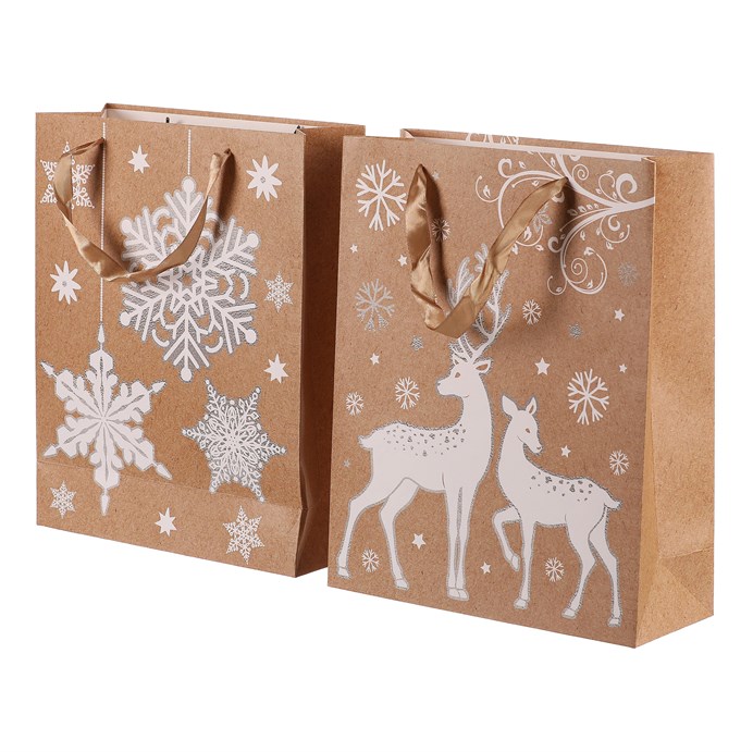 Vánoční papírové tašky, v tomto případě s motivem bílých sněhových vloček nebo jelenů na světle hnědém pozadí, jsou praktickým a elegantním řešením pro jednoduché, rychlé a efektivní umístění dárků. Už se nemusíte trápit s pracným balením do klasického papíru, ale jednoduše vložíte překvapení do tašky a máte hotovo! Díky svátečnímu vzoru získává váš dárek jedinečný vzhled, který obzvlášť potěší, tím spíše, když pro obdarovaného vyberete ten nejlepší z naší široké nabídky svátečních motivů.