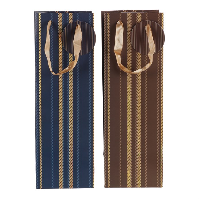 Naše dárkové tašky na víno, v tomto případě s elegantními zlatými pruhy a v mixu dvou barevných variant, nejenže skvěle vypadají, ale jsou praktické a odolné. Dobře se nosí, jsou pevné a skladné. Vaše překvapení, zabalené v takto zdobené tašce udělá velkou radost osobě, kterou dobře znáte, a víte, že má tent styl oblíbený. Nabízíme velké množství ruzných druhů tašek, v závislosti na odlišném vzoru, barvě a velikosti, takže si u nás vybere hravě každý, právě podle vkusu své blízké osoby, které chce udělat radost.