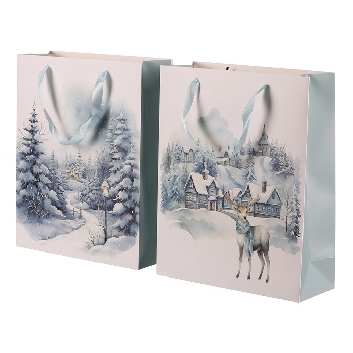 Vánoční papírové tašky, v tomto případě s motivem zasněžené krajiny a v mixu dvou druhů, jsou praktickým a elegantním řešením pro jednoduché, rychlé a efektivní umístění dárků. Už se nemusíte trápit s pracným balením do klasického papíru, ale jednoduše vložíte překvapení do tašky a máte hotovo! Díky svátečnímu vzoru získává váš dárek jedinečný vzhled, který obzvlášť potěší, tím spíše, když pro obdarovaného vyberete ten nejlepší z naší široké nabídky svátečních motivů.