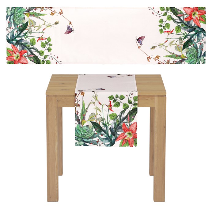 Běhoun na stůl s dekorem exotických rostlin na bílém podkladu je skvělým doplňkem pro váš jídelní stůl či konferenční stolek. S rozměry 40x150 cm je použitelný pro většinu standardních stolů. Lze snadno kombinovat s jinými textiliemi a nádobím pro vytvoření jedinečného vzhledu moderní jídelny či obývacích prostor. 100% polyester se postará o snadnou údržbu a barevnou stálost.