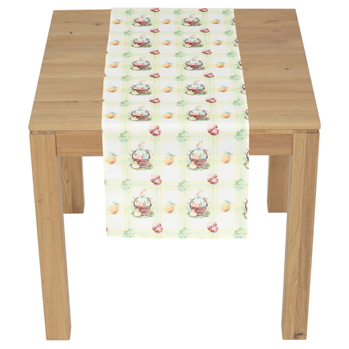 Běhoun s velikonočním motivem v krémovém odstínu přináší do interiéru svěží jarní atmosféru. Je vyroben z 100% polyesteru, který se snadno udržuje a zachovává si barevnou stálost. Rozměry 40 x 150 cm umožňují univerzální použití na stoly různých velikostí. Jemný vzor s košíčky, vajíčky a květy podtrhuje sváteční charakter dekorace a vhodně doplní jarní výzdobu. Díky lehkému materiálu je běhoun praktický i estetický doplněk pro každodenní i slavnostní stolování.