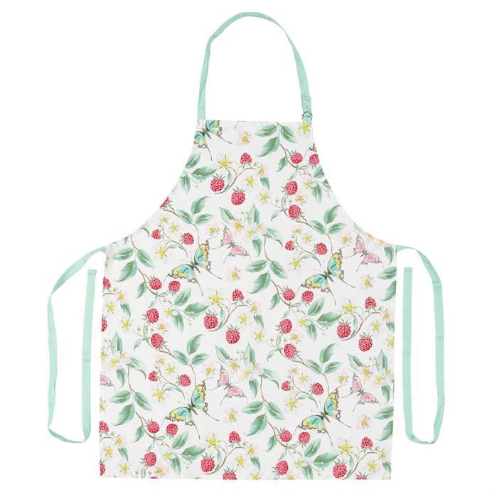 Tato látková zástěra s motivy zralých malin a nádhernými motýly je skvělým doplňkem pro všechny kuchaře do kuchyně i pro venkovní grilování a pikniky. Když si tuto zástěru na sebe nasadíte, budete nejen chráněni před skvrnami a špínou, ale také budete vypadat, jako byste měli kousek barevné louky či zahrádky sami na sobě. Budete tak stylově sladěni především do jarních nebo letních dnů. V této zástěře budete sklízet obdivy u všech kolem vás a budete oku lahodícím středem pozornosti.