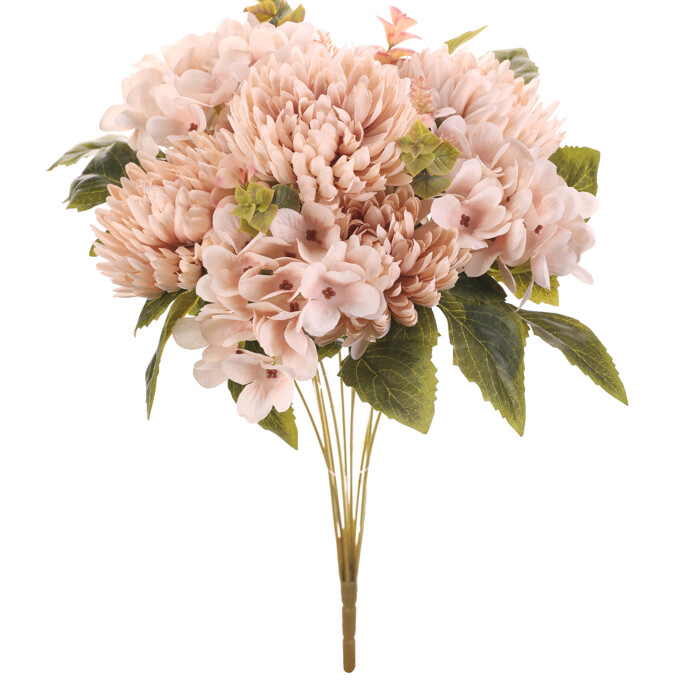 Umělá kytice kombinuje květy chryzantémy a hortenzie v jemných krémových odstínech, které působí přirozeně a vkusně. Textilní materiál věrně napodobuje strukturu a tvar květů i listů, což zajišťuje dlouhodobou stálost vzhledu bez nutnosti péče. Kytice je vhodná pro dekoraci interiérů, kde přinese svěží a elegantní atmosféru po celý rok.