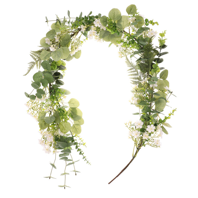 Umělá girlanda o délce 150 cm kombinuje zelené listy s jemnými bílými květy, které vytvářejí přirozený a svěží vzhled. Provedení z textilu dodává girlandě realistickou texturu a příjemný vizuální efekt. Vhodná je pro dekoraci interiérů i exteriérů, kde vnese nádech přírody bez nutnosti údržby. Girlanda se snadno tvaruje a upevňuje, což umožňuje kreativní využití na různých místech jako jsou okna, dveře nebo zábradlí.