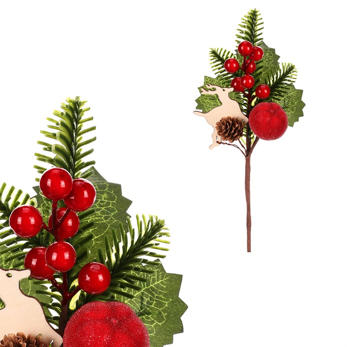Umělá vánoční větvička s dřevěným jelenem je skvělým doplňkem pro váš sváteční interiér. Celkově, s červenými bobulemi a jablky, jehličím, umělými zelenými lístky a šiškou, přináší do vašeho domova jedinečnou vánoční atmosféru. Dřevěná ozdoba ve tvaru jelena dodává větvičce na originalitě, ale současně si ponechává autentický přírodní vzhled. Všechny její části vypadají skutečně, jako by byly ze živých rostlin. Navíc díky trvanlivosti této dekorace nemusíte mít obavy z opadávání nebo uvadání, a tak ji můžete využívat jako trvalou ozdobu každý rok.