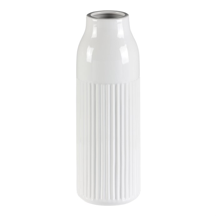 Keramická váza v bílé glazované barvě se zúženým hrdlem a jemným vzorem svislých vlnek na povrchu, dodá vašemu interiéru elegantní a sofistikovaný vzhled. Jednobarevné provedení a hladký design z ní činí univerzální dekoraci a skvělý základ pro oblíbené květiny. Hodí se tak do jakéhokoli prostoru, ať už na stůl, poličku nebo komodu.