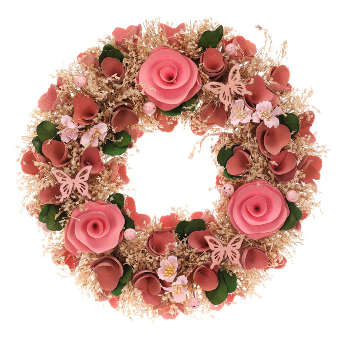 Slaměný věnec o průměru 30 cm je zdobený růžovými květy z polystyrenu a drobnými mini vajíčky, které mu dodávají jemný jarní charakter. Kombinace přírodních odstínů slámy s růžovými detaily vytváří příjemný vizuální efekt vhodný pro dekoraci interiérů i vstupních prostor. Věnec je lehký a snadno se zavěšuje, čímž umožňuje jednoduché umístění na dveře nebo stěnu. Jemné zelené lístky a motivy motýlků podtrhují celkovou atmosféru svěžesti a něžnosti. Hodí se pro sezónní výzdobu i jako doplněk k dalším dekoracím.