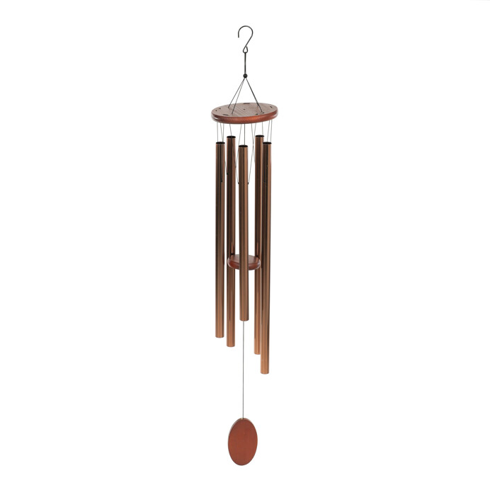 Zvonkohra s kovovými trubicemi v měděném odstínu a dřevěnými doplňky vytváří příjemný zvukový efekt vhodný pro zavěšení na terasu, balkon či do interiéru. Horní část i závěsné prvky jsou z přírodního dřeva, které doplňuje hladký kov trubic laděných do měděné barvy. Díky lehkému provedení a praktickému háčku je snadno přenosná a zavěsitelná. Zvonkohra přináší jemné tóny, které se mění podle síly větru a vytváří tak relaxační atmosféru. Je vhodná pro venkovní i vnitřní použití jako dekorativní prvek s příjemným zvukem.