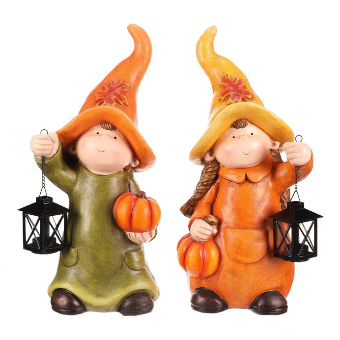 Figurky dětí z magnesia, které drží v rukou lucernu na vložení svíčky, budou roztomilým oživením vaší zahrady, terasy či balkonu. Jsou k dostání ve dvou podobách, přičemž obě jsou barevně laděné do podzimních barev. Tento nádech umocňují dýně, které drží v ručičkách a špičaté čepičky, které jsou ozdobené barevným listem.