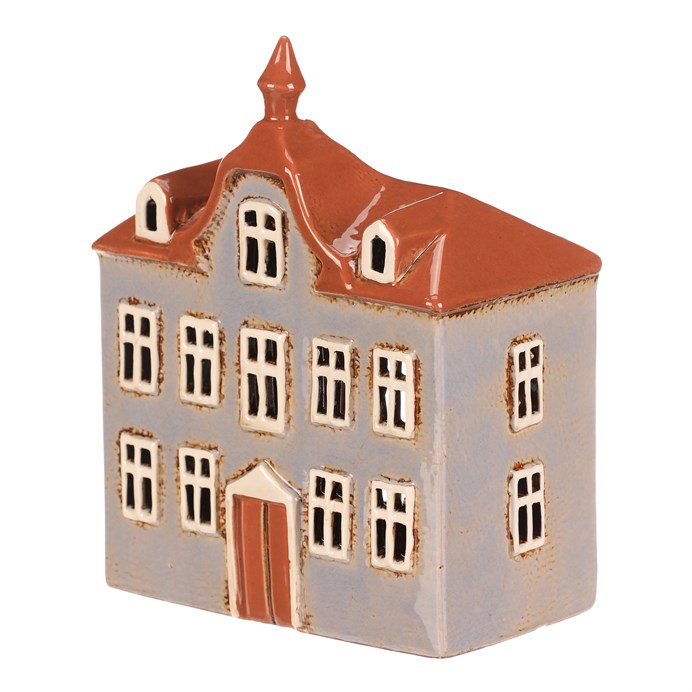 Keramický domek ve tvaru radnice se světle modrou fasádou a oranžovou střechou je stylovou dekorací na čajovou svíčku. Po zapálení svíčky bude světlo krásně prosvítat okénky a vytvoří jedinečnou atmosféru. Krásný doplněk pro podzimní i zimní večery.