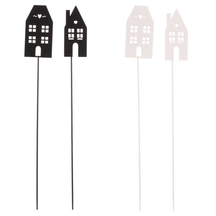 Kovový zápich ve tvaru domečku je dostupný v mixu čtyř různých variant v černém provedení. Jednoduchý a stylový design s vyřezávanými okny a srdíčkem vytváří příjemný dekorativní efekt. Díky tenkému zápichu je vhodný pro ozdobení květináčů, truhlíků nebo zahradních aranžmá. Povrch kovu je upraven tak, aby se snadno udržoval a dlouhodobě zachoval svůj vzhled. Cena uvedená je za jeden kus z mixu čtyř druhů.