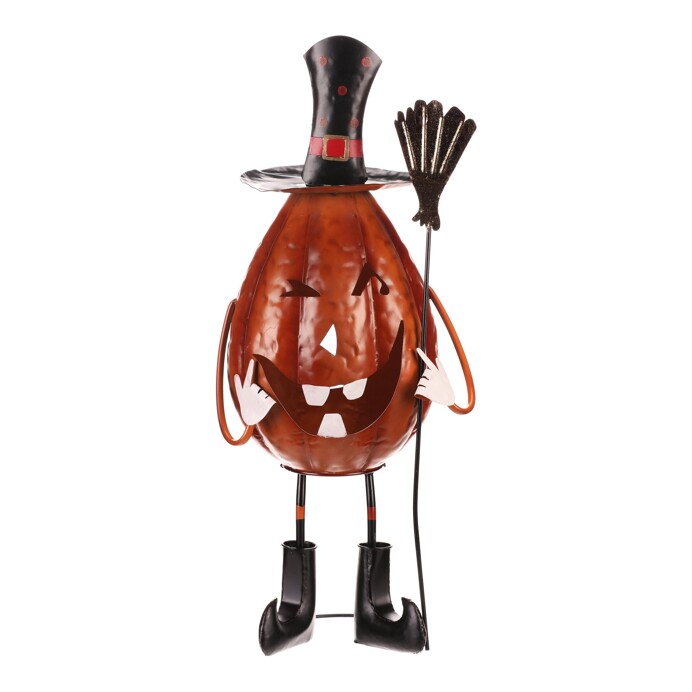 Oranžová kovová dýně s kloboukem a smetákem sice vypadá strašidelně, ale její veselý výraz napoví, že to s tou hrůzou nebude tak zlé. Ideální dekorace na Halloween i podzimní večery, která potěší každého, kdo má rád trochu tajemna s úsměvem.