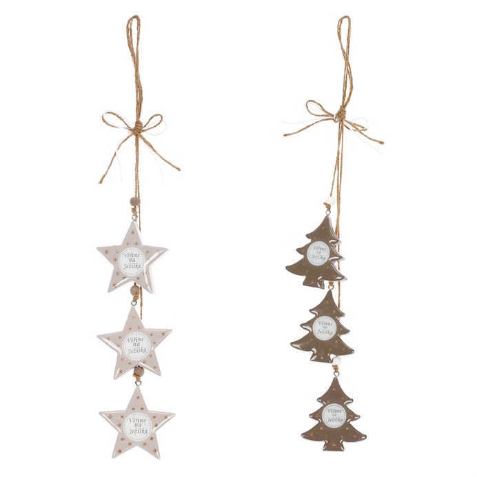 Tato okouzlující girlanda z dřevěných ozdob je skvělým doplňkem pro váš vánoční interiér. Najdete tu mix dvou různých druhů, buď béžových hvězdiček, nebo hnědých stromečků. Vždy jsou na jednom provázku celkem tři ozdoby jednoho typu. Každá z nich je navíc doplněna v kruhovém bílém středu dojemnou větou „Věříme na Ježíška. Díky provázku můžete tyto krásné ozdoby snadno pověsit kamkoli ve vašem domě, ať už na stromeček, stěnu, dveře nebo okno. Užijte si jedinečnou atmosféru vánočních svátků obklopeni nádhernými dekoracemi, jakými jsou bezesporu i tyto půvabné girlandy.