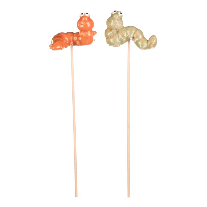 Keramická housenka na dřevěné špejli v oranžovém a zeleném provedení přináší hravý dekorativní prvek vhodný pro ozdobení květináčů, zahradních aranžmá nebo interiérových květin. Každý kus je ručně tvarovaný s důrazem na detail, což dodává výrobku jedinečný charakter. Dlouhá dřevěná špejle umožňuje snadné zapíchnutí do zeminy či substrátu a stabilní držení. Housenka je ideální pro vytvoření veselého a přírodního vzhledu v domácnostech i na zahradách. Cena je uvedena za jeden kus, dodávaný v mixu dvou barevných variant.