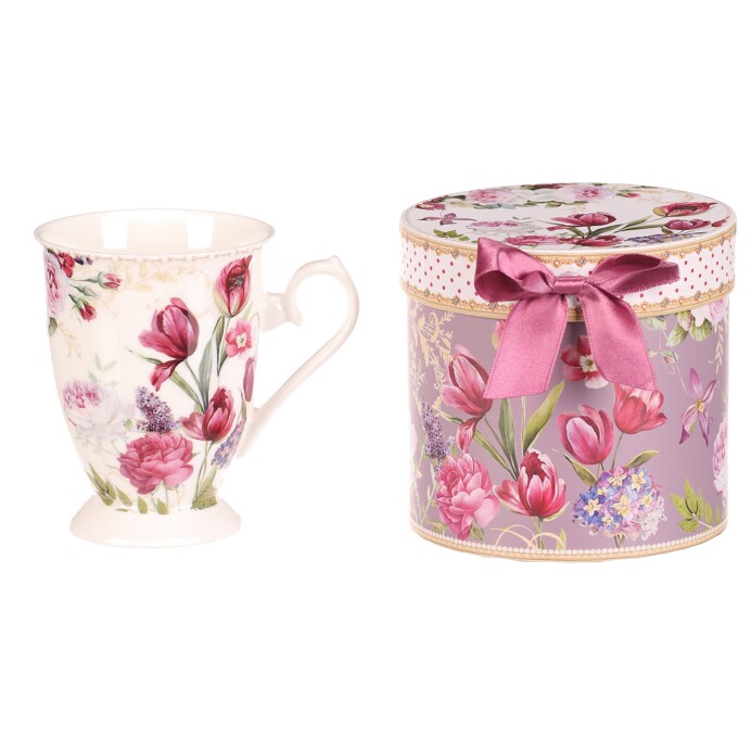 Porcelánový hrnek s jemným květinovým motivem v odstínech fialové a růžové je doplněn o praktickou dárkovou dózu se stejným vzorem a saténovou stuhou. Hrnek má elegantní tvar s ozdobným uchem a mírně rozšířeným okrajem, což usnadňuje pití. Porcelánové provedení zajišťuje snadnou údržbu a dlouhou životnost, vhodný je pro každodenní použití i jako stylový dárek. Dárková dóza chrání hrnek při skladování nebo přepravě a zároveň podtrhuje estetickou hodnotu celého setu.