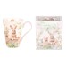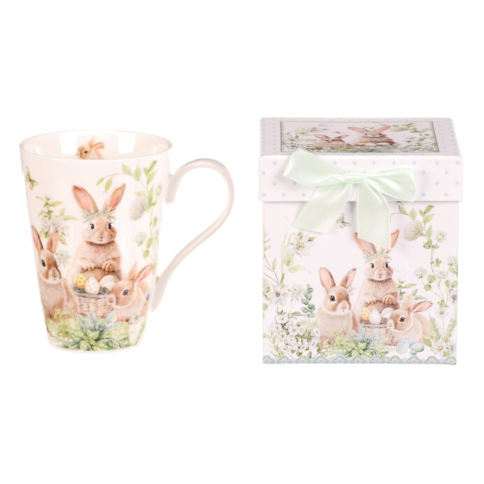 Porcelánový hrnek s jemným malovaným motivem zajíčků v přírodních odstínech přináší do každodenního pití nápojů příjemnou atmosféru. Hrnek je doplněn dárkovou dózou se stejným motivem a světle zelenou stuhou, která podtrhuje jeho dekorativní charakter a činí z něj vhodný dárek. Bílé provedení porcelánu zvýrazňuje detailní malbu a zajišťuje snadnou údržbu. Hrnek má klasický tvar s pohodlným uchem pro snadné držení. Je vhodný pro běžné použití doma i v kanceláři.