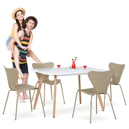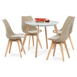 Jídelní stůl o rozměrech 120x80x74 cm kombinuje pevnou desku z MDF s matnou bílou povrchovou úpravou a nohy z masivního buku, které dodávají stabilitu a přírodní vzhled. Deska stolu je navržena s jemně zaoblenými rohy pro bezpečnost a pohodlí při používání. Masivní bukové nohy jsou vybaveny rektifikačními patkami, které umožňují vyrovnání nerovností podlahy a zajišťují stabilitu stolu. Matný lak na desce usnadňuje údržbu a odolává běžnému opotřebení. Stůl je pevný a vhodný pro každodenní použití v jídelnách i kuchyních.