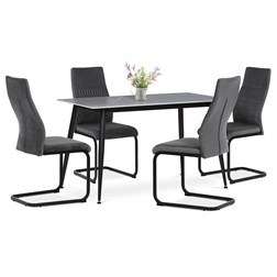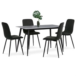 Jídelní stůl s rozměry 130x70x76 cm nabízí desku z kvalitní slinuté keramiky v imitaci matného šedého mramoru, která je odolná vůči poškrábání a snadno se udržuje. Černé kovové nohy s mírně zkoseným tvarem zajišťují stabilitu a pevnost celé konstrukce, přičemž jejich povrchová úprava zabraňuje korozi. Zaoblené rohy desky přispívají k bezpečnosti a zároveň dodávají moderní vzhled. Stůl je vhodný pro každodenní použití v jídelnách i kuchyních, kde oceníte kombinaci praktičnosti a stylového designu. Díky pevnému materiálu a kvalitnímu zpracování je navržen pro dlouhou životnost.