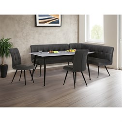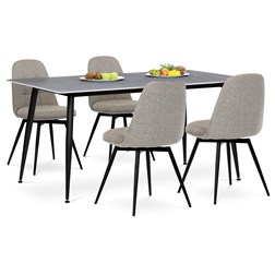Jídelní stůl o rozměrech 160x90x76 cm kombinuje moderní design s praktickými vlastnostmi. Deska je vyrobena ze slinuté keramiky v imitaci matného mramoru, která nabízí pevný a odolný povrch snadno udržovatelný v čistotě. Černé kovové nohy jsou tvarované do mírně zúžených sloupků, které zajišťují stabilitu a pevnost celé konstrukce. Matná povrchová úprava desky podtrhuje elegantní vzhled a zároveň minimalizuje odlesky. Stůl je vhodný pro každodenní použití v jídelnách i moderně zařízených interiérech.