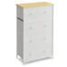 Komoda o rozměrech 56x30x93 cm kombinuje pevnou kovovou konstrukci s bílou MDF deskou v dekoru dřeva, která je upravena matným povrchem pro snadnou údržbu. Čtyři prostorné zásuvky z netkané textilie v šedém odstínu poskytují praktický úložný prostor s lehkým přístupem a přispívají k modernímu vzhledu komody. Kovové nohy zajišťují stabilitu a dlouhou životnost, zatímco jednoduché kulaté úchytky usnadňují manipulaci se zásuvkami. Díky kompaktním rozměrům je vhodná do menších prostor, kde oceníte kombinaci funkčnosti a decentního designu.