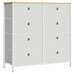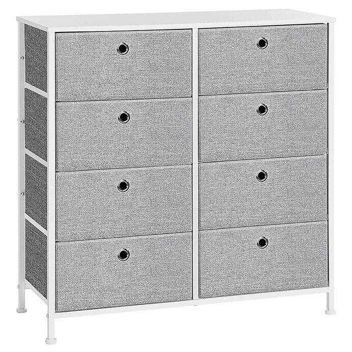 Komoda o rozměrech 80x30x82 cm kombinuje pevnou kovovou konstrukci s deskou z MDF v matném bílém provedení, která zajišťuje stabilitu a snadnou údržbu. Osm látkových zásuvek v šedé barvě nabízí praktický úložný prostor pro různé drobnosti a textilní materiál zásuvek přispívá k lehkému a vzdušnému vzhledu. Kovové nohy jsou vybaveny plastovými krytkami, které chrání podlahu před poškozením. Komoda je vhodná do moderních i minimalistických interiérů, kde oceníte kombinaci funkčnosti a jednoduchého designu.