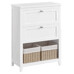 Koupelnová skříňka o rozměrech 60x30x80 cm je vyrobena z MDF s matnou bílou povrchovou úpravou, která zajišťuje snadnou údržbu a odolnost vůči vlhkosti běžné v koupelnovém prostředí. Konstrukce nabízí dva prostorné výklopné úložné prostory s decentními kovovými úchytkami, které umožňují pohodlný přístup k uloženým věcem. Spodní část doplňují dvě proutěné košíky s textilními vložkami, ideální pro organizaci drobností a hygienických potřeb. Stabilní nohy z MDF podporují pevnost a stabilitu celé skříňky. Díky kompaktním rozměrům a praktickému uspořádání je vhodná do menších i větších koupelen, kde poskytuje efektivní řešení úložného prostoru.