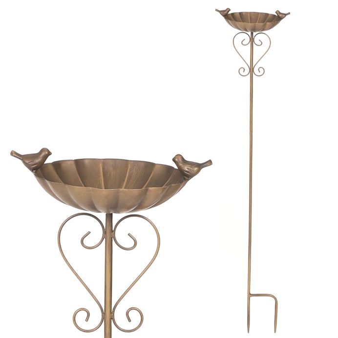 Krmítko/pítko - kovový zápich, miska s ptáčky, měděné