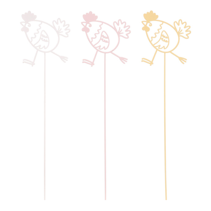 Kovový zápich ve tvaru kuřete v provedení mixu tří barev je vhodný pro dekorativní zvýraznění květinových aranžmá, zahradních záhonů nebo květináčů. Jednoduchý a lehký design s tenkým zápichem umožňuje snadné zapíchnutí do zeminy či substrátu. Povrchová úprava zajišťuje odolnost vůči povětrnostním vlivům, což umožňuje použití jak v interiéru, tak venku. Velikost L poskytuje výrazný vizuální efekt a přispívá k tematickému dekoru zejména v jarním období.