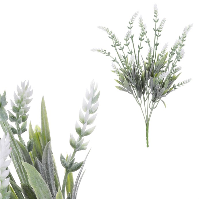 Levandule je všestranným darem přírody, který nabízí klid, krásu a smyslové potěšení. Náš trs umělých levandulových lístků s něžnými bílými květy předává všem aranžérům do rukou cenný nástroj pro dekorování věnců, stolních aranží, květinových vazeb a dokonce i pro zdobení truhlíků. Jejich přítomnost dodá vašim kompozicím nádech romantiky a sentiment spojený s příjemnými vzpomínkami na klidné chvíle strávené na venkovské chalupě.