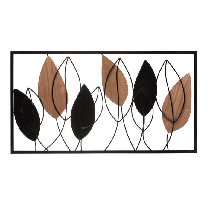 Tato nástěnná dekorace s listy v rámu spojuje eleganci kovu a přírodní krásu dřeva. Černý obvodový rám a listy v kombinaci hnědé a černé barvy vytvářejí sofistikovaný a moderní vzhled, který skvěle doplní každou stěnu. Kovové drátky a dřevěné prvky dodávají dekoraci nevšední texturu a vizuální zajímavost. Ideální pro oživení interiéru, na pověšení do obývacího pokoje, chodby nebo pracovny.