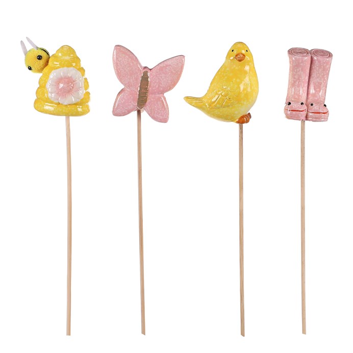 Keramické ozdoby na špejli jsou skvělým způsobem, jak přivítat jaro a velikonoční období s radostí. Mix 4 druhů – motýlek, ptáček, včelka s úlem a holínky – přinášejí do vašich truhlíků, květníků i záhonů veselou a barevnou atmosféru.