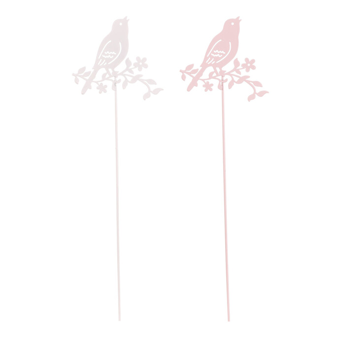 Kovový zápich ve tvaru ptáčka sedícího na větvi v jemných bílých a růžových odstínech přináší do zahrady či květináče decentní dekorativní prvek. Jeho štíhlý zápich umožňuje snadné zapíchnutí do zeminy a zvýraznění rostlin nebo záhonů. Povrch je upravený tak, aby odolával venkovním podmínkám a zachoval si svůj vzhled po dlouhou dobu. Vynikne v kombinaci s květinami i zelení a dodá prostoru lehkost a přírodní atmosféru.
