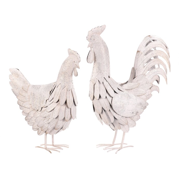 Dekorativní figurka slepice nebo kohouta je vyrobena z kovu s bílou patinou, která dodává výrobku rustikální vzhled. Detailní zpracování peří a tvaru zvířat podtrhuje jejich realistický charakter a zároveň přináší zajímavý vizuální efekt. Každá figurka je určena k postavení, což umožňuje snadné umístění na poličku, komodu nebo zahradní dekoraci. Bílá barva s patinou se hodí do různých stylů interiérů i exteriérů, kde přispívá k příjemné atmosféře.