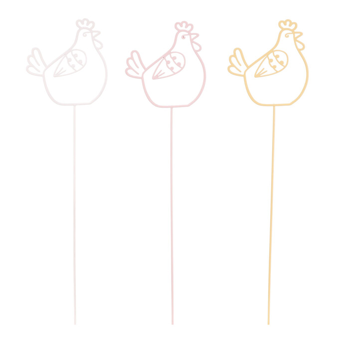 Kovová slepička na zápichu ve velikosti L je dostupná v mixu tří barev, které přinášejí hravý a veselý akcent do zahradních či interiérových aranžmá. Jednoduchý a lehký design umožňuje snadné zapíchnutí do zeminy, květináče nebo dekorativního substrátu. Povrch je hladký s decentním leskem, který podtrhuje minimalistický tvar slepičky. Tento zápich je vhodný pro oživení jarních i velikonočních dekorací a přispívá k příjemné atmosféře prostoru.