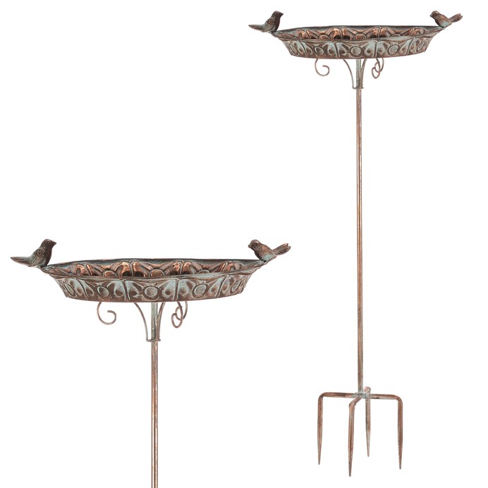 Kovová mísa na vysokém zápichu (téměř 90 cm) je krásnou a praktickou ozdobou do zahrady. Zdobí ji dva pěvci na okrajích a díky měděné barvě působí elegantně. Může sloužit jako krmítko pro ptáčky nebo jako základ pro aranžování. Stylový doplněk, který přinese život do vaší zahrady.