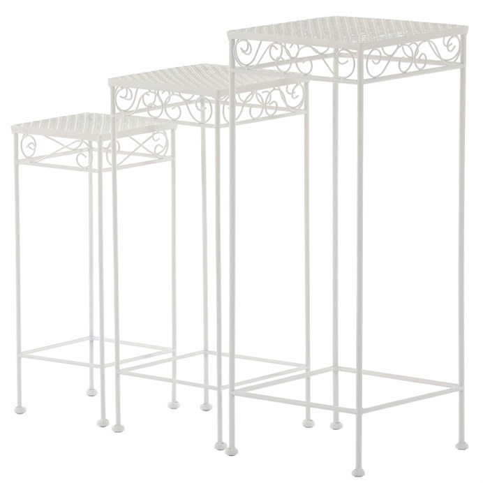 Sada tří stojanů na květiny v bílém kovovém provedení nabízí variabilní řešení pro vystavení rostlin v interiéru i na terase. Každý stojan má čtvercovou desku s dekorativními kroužky podél okrajů, které dodávají lehkost a vzdušnost celkovému designu. Stabilní kovová základna s ochrannými krytkami nohou zajišťuje pevnost a ochranu podlahy. Různé výšky stojanů umožňují zajímavé aranžmá květin a dekorací, které prostor opticky oživí a zpestří.