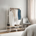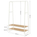 Věšák s dvěma policemi v bílém provedení kombinuje pevnou kovovou konstrukci s praktickými policemi z MDF s dubovým dekorem, které poskytují dostatek úložného prostoru pro obuv nebo doplňky. Stabilní rám je navržen v nadčasovém designu s oblými hranami, což zajišťuje bezpečné a pohodlné používání. Horní část věšáku nabízí dostatečnou délku pro zavěšení oděvů na ramínka, zatímco po stranách jsou umístěny kovové háčky pro zavěšení menších předmětů. Povrchová úprava kovu je hladká a snadno udržovatelná, což přispívá k dlouhé životnosti produktu. Rozměry a nosnost odpovídají běžným požadavkům na domácí i komerční použití.