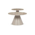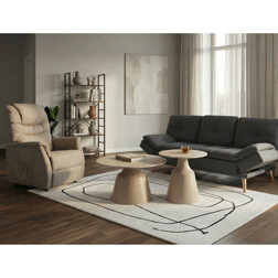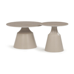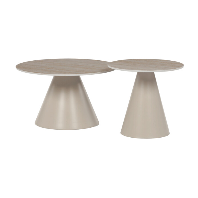 Sada konferenčních stolů v moderním stylu kombinuje keramické desky s dekorem travertinu a stabilní kovové podnože v béžovém matném provedení. Větší stůl má průměr 70 cm a výšku 40,5 cm, menší pak průměr 50 cm a výšku 47 cm, což umožňuje variabilní uspořádání v prostoru. Keramická deska je navržena pro snadnou údržbu a odolnost vůči běžnému opotřebení, zatímco pevná kovová podnož zajišťuje stabilitu a dlouhou životnost. Design stolů je minimalistický s jemnými přírodními odstíny, které přispívají k příjemné atmosféře v obývacím pokoji nebo kanceláři. Sada je ideální volbou pro ty, kdo hledají kombinaci funkčnosti a decentního designu.