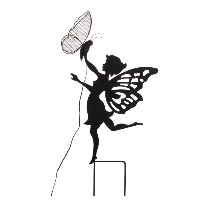 Černý kovový zápich ve tvaru víly s motýlem je doplněn o LED osvětlení, které vytváří jemný světelný efekt a zvýrazňuje detaily siluety. Víla je zobrazena v dynamické pozici s roztaženými křídly a nataženou rukou, která drží motýla s jemnou texturou křídel. Zápich je vhodný pro dekoraci zahrad, květináčů nebo venkovních záhonů, kde přidá kouzelnou atmosféru zejména za soumraku. Kovové provedení zajišťuje stabilitu a odolnost vůči povětrnostním vlivům. LED osvětlení je napájeno bateriemi a je nenáročné na údržbu.
